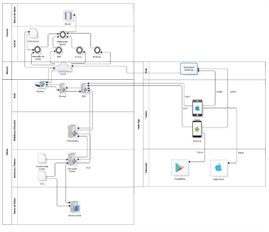 Solução: Abaixo uma arquitetura macro do produto Mobilidade, considerando itens de infra do cliente e na nuvem.