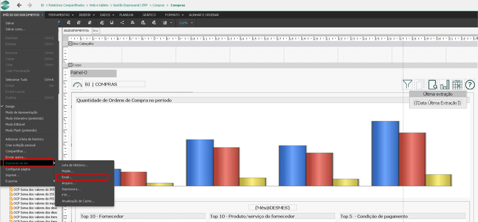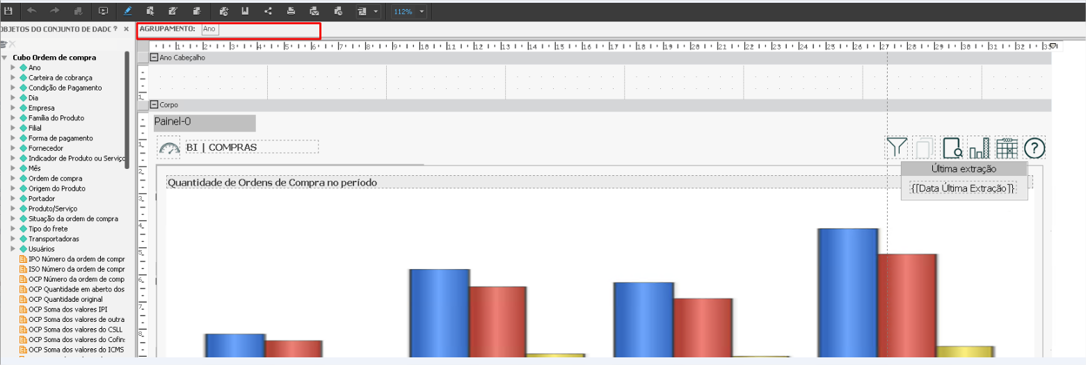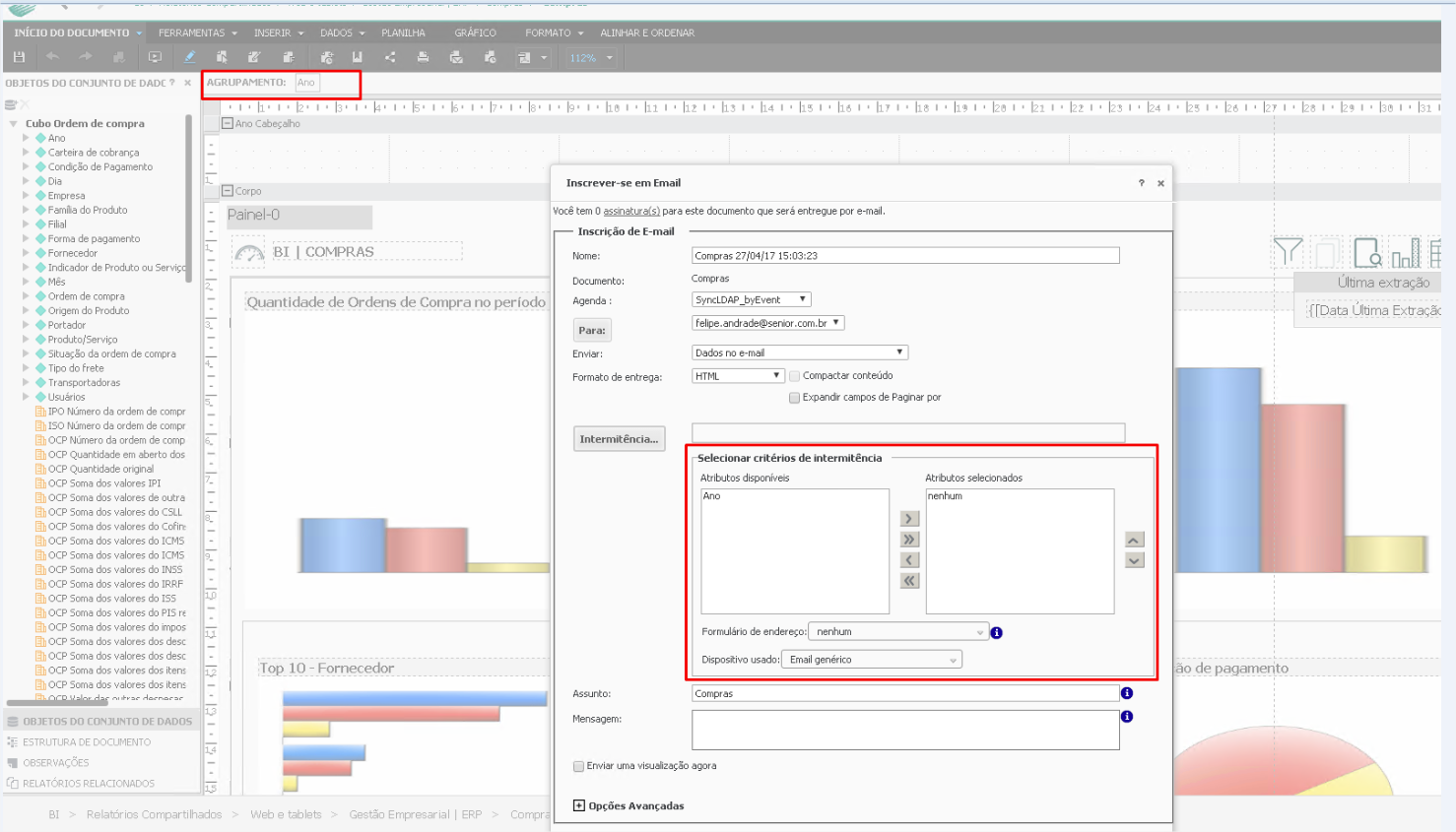 2 - Envio de dashboards: Acesse o dashboard desejado, clique no botão Editar e na parte superior da tela, no campo Agrupamento informe o(s) objeto(s) que será/serão utilizados para intermitência: