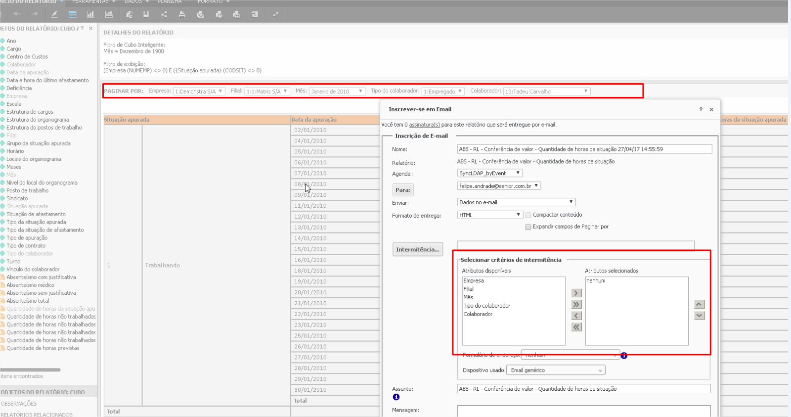 Solução: O campo intermitência refere-se, basicamente, a quebra do relatório para envio. De acordo com a documentação da MicroStrategy (http://www2.microstrategy.com/producthelp/10.3/WebUser/WebHelp/Lang_1046/Content/Email_on_schedule.htm):