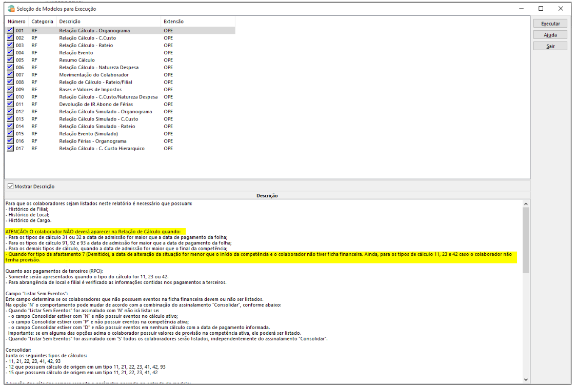 Rotina / Tela: Cálculos > Relatórios > Operacionais > Relação Cálculo