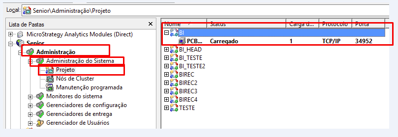 3 - Na tela que será exibida a direita, clicar com o botão direito em BI e selecionar Administrar > Carregar Projeto.