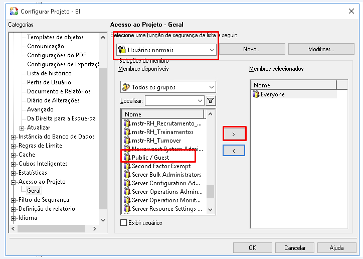 7 - Clique em Acesso ao projeto > Geral. Selecione Usuários Normais e na parte inferior selecione Public / Guest e clique na seta > e salve a alteração. Print da tela:
