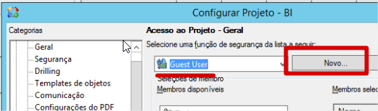 3) Através do botão Novo, criar uma função de segurança (no exemplo abaixo foi criado com o nome de Guest User):