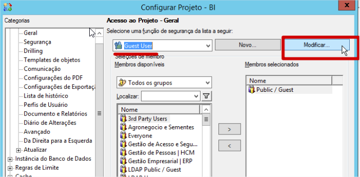 4) Selecionar o grupo Public/Guest e clicar em Modificar:
