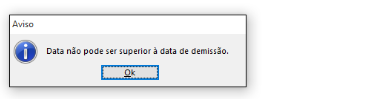 Solução: O cadastro do colaborador demitido possui lançamentos de atestados (situação 14) na competência 08/2017 (competência da geração da Sefip) e por este motivo estava sendo considerado na geração (devido a movimentação do colaborador, no registro 32). De forma nativa no sistema, não é possível efetuar afastamentos após a data de demissão para o colaborador, ao tentar realizar este procedimento o sistema emite o aviso abaixo: