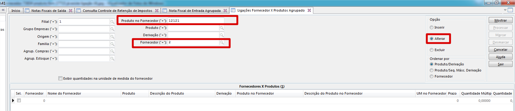 ERP – Ligações Fornecedor X Produtos Individual – Produto do Fornecedor (XXXXX) já com ligação para essa filial