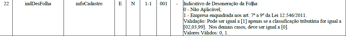 - A desoneração da folha só pode ser diferente de 1 - Não se aplica se a classificação tributária for igual a 02, 03 ou 99. Nos demais casos, deve ser 00 igual a 0.