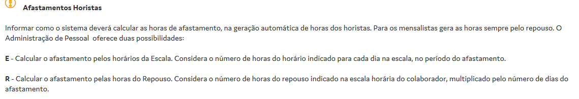 Solução: Essa situação ocorre devido a informação do campo Afastamentos Horistas, em Empresas > Empresas.