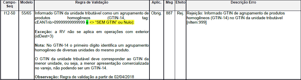 Informação adicional: esta validação foi removida do sistema a partir da versão 5.8.10.71 conforme a remoção da rejeição 887 - Informado GTIN de agrupamento de produtos homogêneos (GTIN-14) no GTIN da unidade tributável com a publicação da versão 1.30 da NT 2017.001 pela SEFAZ.