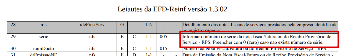 Descrição do Problema: Erro ao integrar arquivo: mensagem: Arquivo XML não segue o formato exigido : The 'http://www.reinf.esocial.gov.br/schemas/evtTomadorServicos/v1_02_00:serie' element is invalid - The value '' is invalid according to its datatype 'String' - The actual length is less than the MinLength value. Linha: 27, posição: 14.