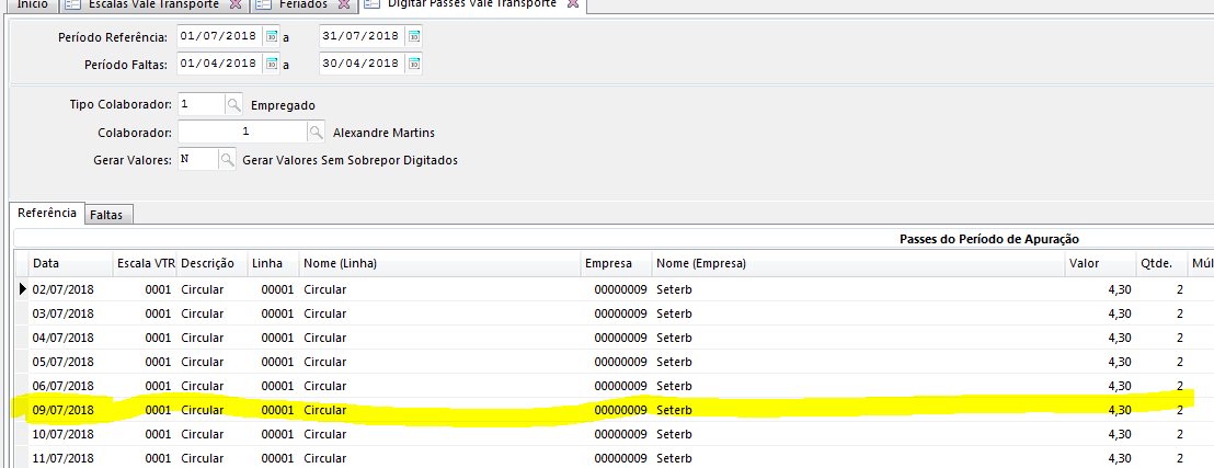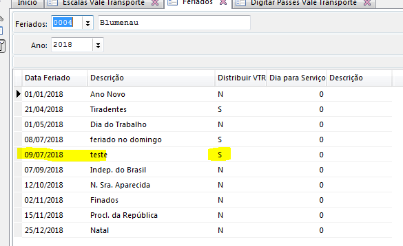 E em Colaboradores > Vale Transporte > Cadastro > Escala, a escala de Vale Transporte deve ter informado quantos passes devem ser distribuídos no Feriado.