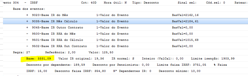 Problema: Como conferir se o cálculo feito hoje pela sistema sobre o acumulador 9035 -Base IR Mês Cálculo, está de acordo.