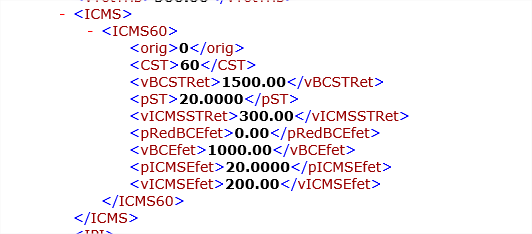 Assim as tags referentes ao ICMS Efetivo são geradas no XML conforme exemplo na imagem abaixo: