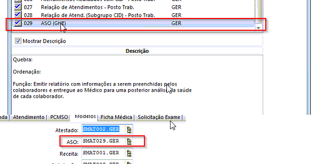 Neste caso é necessário verificar qual o modelo está configurado para listar o ASO em Medicina > Definições > aba Modelos. O relatório de ASO por GHE é o SMAT029.GER: