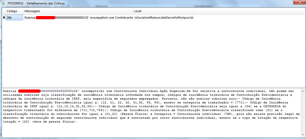 23003 - Rubrica 'XXX' incompatível com contribuinte individual (PLR)