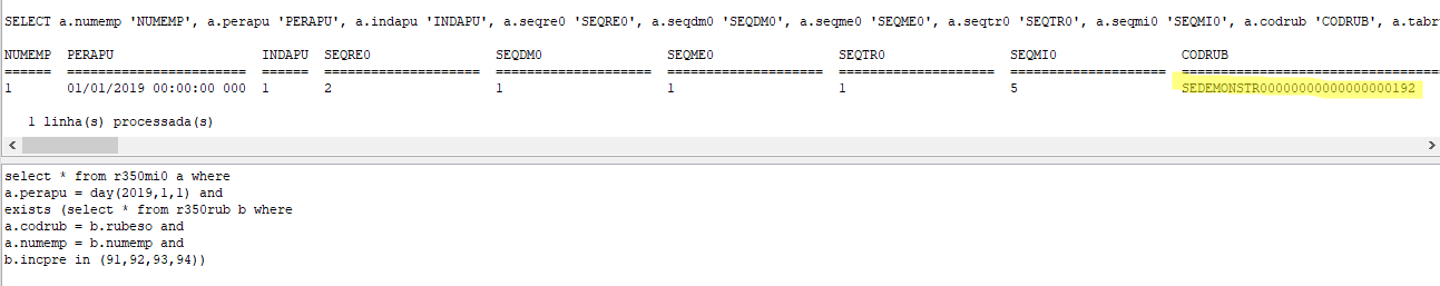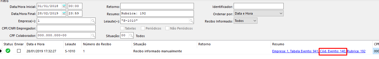 Solução: Se o valor da suspensão no S-5011 é superior ao eSocial, significa que subiu ao eSocial algum S-1200/S-2299 com tributação suspensa que atualmente não consta na relação de INSS, podem ser seguidas as dicas abaixo para conferência: 1. Confira todas as fichas financeiras de colaboradores demitidos no mês. Pode acontecer da ficha financeira de algum demitido não estar calculada, e por este motivo este valor não consta na relação de INSS; 2. Verificar no seu resumo de folha de pagamento desta competência na filial onde ocorre a diferença, se existe algum evento que somando o desconto de todos os colaboradores resultou no valor da diferença na base (além do imposto suspenso, o S-5011 e a relação de INSS mostram a base considerada). Pode ser que na folha este evento não esteja com tributação suspensa, mas no S-1010 do eSocial subiu como suspenso; 3. Analise se todos os eventos que estão com a tributação suspensa (na guia liminar, no cadastro da empresa/filial) estão com o indicativo de INSS = + no cadastro do evento, na guia incidências. Lembrando que se existe liminar para não recolhimento do INSS, o evento permanece com indicativo de INSS = + e a suspensão se dá em virtude da Liminar. Não pode existir evento na guia liminar cuja a incidência de INSS esteja como N; 4. Efetue o select abaixo: select * from r350mi0 a where a.perapu = day(2019,1,1) and exists (select * from r350rub b where a.codrub = b.rubeso and a.numemp = b.numemp and b.incpre in (91,92,93,94)) Este select retornará como resultado todos os S-1200 que tiveram rubricas enviadas com o código de incidência = 91,92,93,94, que estão com os códigos de suspensão no eSocial. Desta forma, você conseguirá conferir se alguma das rubricas que foram enviadas como suspensas, na verdade não são suspensas na ficha financeira. O select vai retornar o codrub, conforme exemplo abaixo: Munido do CODRUB, você pode verificar qual o evento e se de fato ele é suspenso em eSocial > Consultar pendências, informando uma abrangência de data de 01/01/2018 a 28/02/2019, leiaute S-1010 e no campo resumo informar o final do código da rubrica, conforme exemplo abaixo: ![]() |
