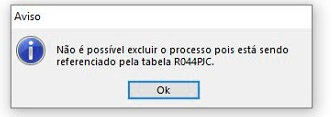 Aviso: Não é possível excluir o processo pois está sendo referenciado pela tabela R044PJC.