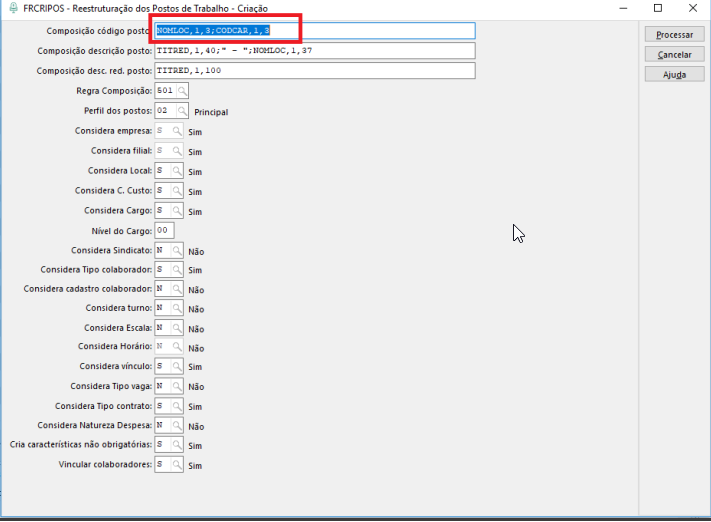 Verificar como está a composição dos códigos dos postos que serão gerados pelo sistema. No caso que gerou esta dica, a mensagem Falha ao processar o posto de trabalho XXXX: Não é possível inserir um registro a chave duplicada, exibida no log de processamento da tela, ocorria pois foi definido que para a formulação do código do posto, seria utilizado o nome do Local (NOMLOC) e o código do Cargo (CODCAR), conforme podemos conferir na imagem a seguir: