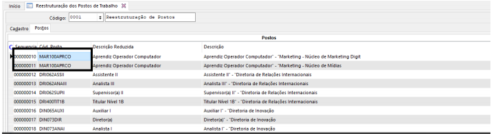 Entretanto, esta estratégia para o caso avaliado, ainda permite que sejam geradas Postos de Trabalho com o mesmo código. A seguir temos alguns dos exemplos retirados da tela de reestruturação: