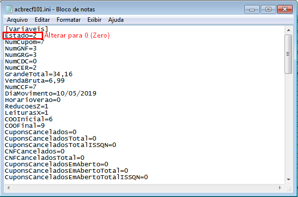Para permitir o uso do PDV, deve-se editar o arquivo, colocando o campo ESTADO, para 0, conforme exemplo abaixo.