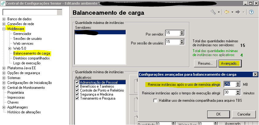 Verificado que nas configurações avançadas para balanceamento de carga das instância de webservices estava configurado para reiniciar as instâncias após o uso de memória atingir 120 MB, foi alterado o valor para 250 MB e reiniciado o serviço do Middleware, tal configuração resolveu o problema.