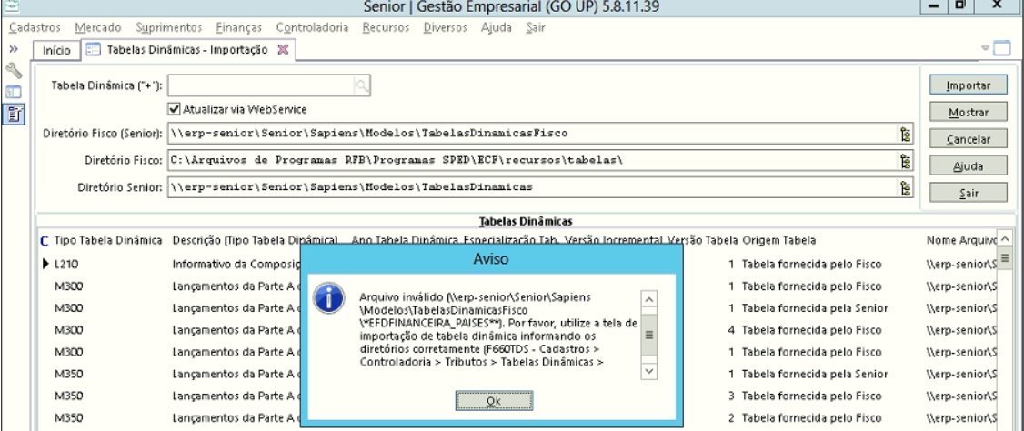 Problema: Na importação das tabelas dinâmicas ocorre o erro da imagem abaixo F660TDS - Cadastros / Controladoria / Tributos / Tabelas Dinâmicas / Importação: