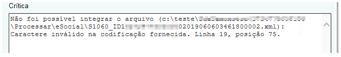 O que ocorre é que o XML retorna na pasta processados com erro de caracter inválido. O que pode ser verificado nesta situação? Erro que ocorre na guia críticas de integração no eDocs: