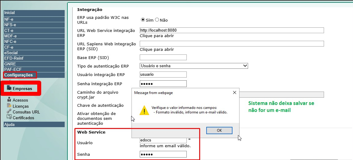 Problema: Ao realizar o cadastro de empresa no eDocs ambiente Cloud (menu: Configurações > Empresas), e informar o usuário do web service ocorre o aviso: Verifique o valor informado nos campos: - Formato inválido, informe um e-mail válido.