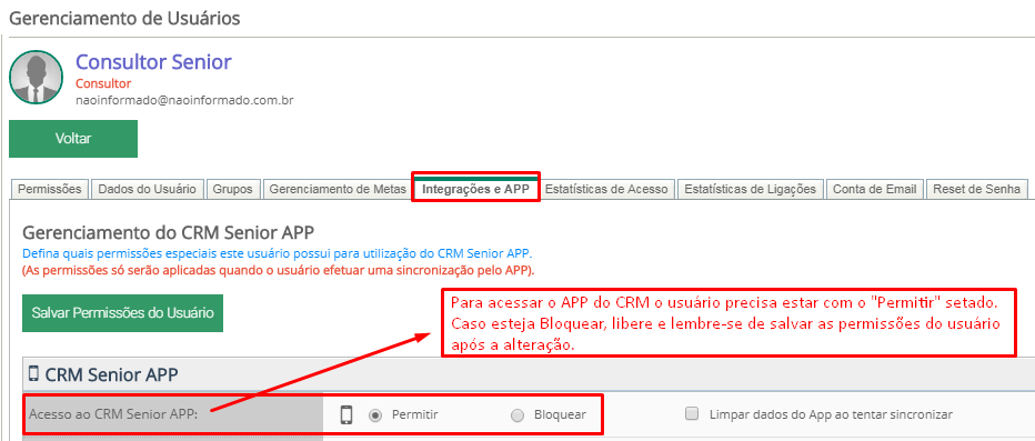 5. Marque 'Permitir' na opção Acesso ao CRM Senior APP, conforme demonstrado abaixo: