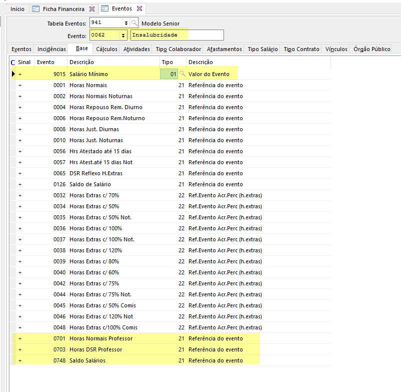 Abaixo exemplo com cadastro do evento de Insalubridade - Aba Base. Na base de calculo do evento informar os eventos de Horas de Professor com tipo 21: