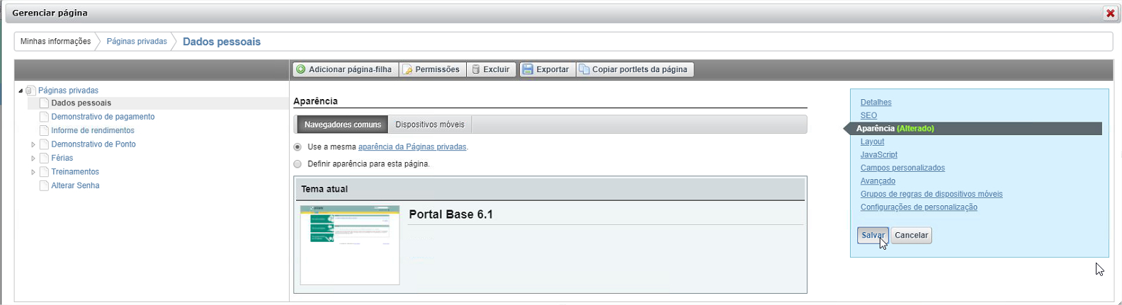 Caso realmente esteja configurado o tema Portal Base 6.1, selecionar a opção 'Use a mesma aparência da Páginas privadas'.