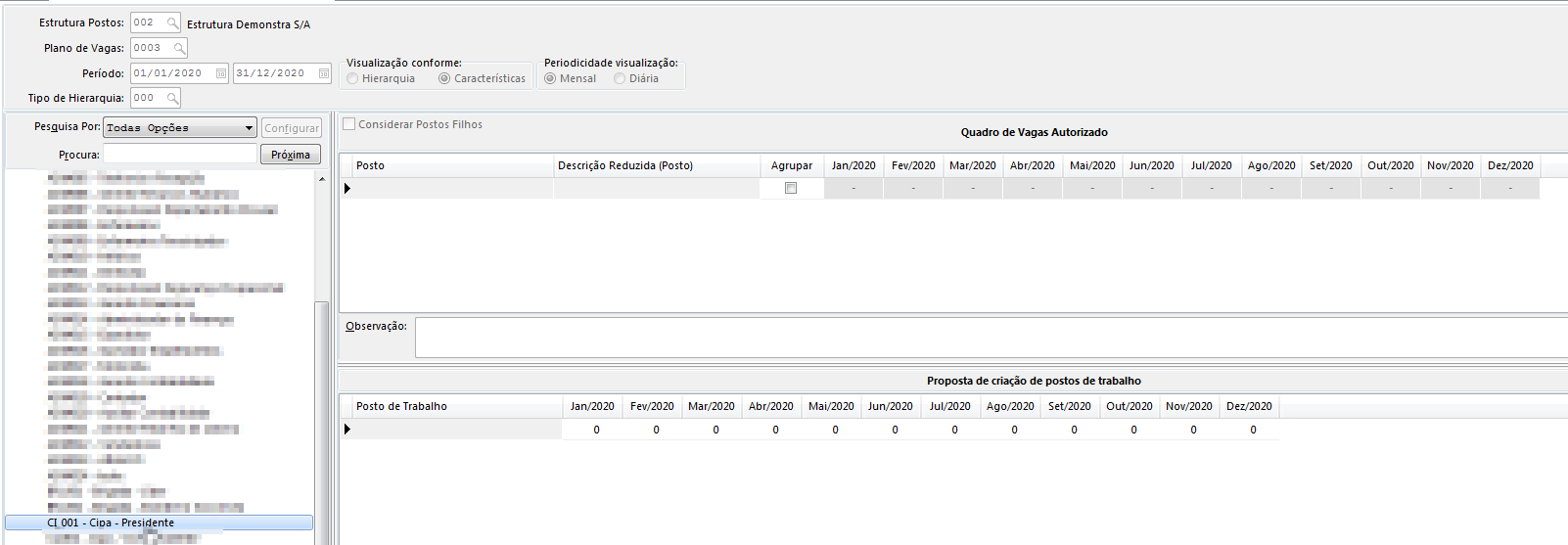Foi realizado o cadastro de novos postos na empresa, porém ao acessar Lotação x Posto > Administrar Quadro Previsto, o Posto de Trabalho não é habilitado na grid 'Quadro de Vagas':