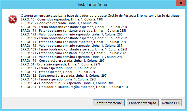 Ocorreu um erro ao atualizar a base de dados do produto Gestão de Pessoas: Erro na compilação de trigger: