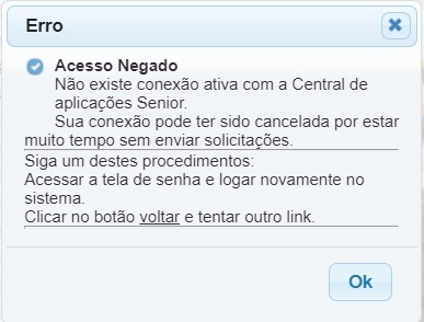 HCM – Currículo Web – Acesso negado. Não existe conexão ativa com a central de aplicações Senior. Sua conexão pode ter sido cancelada por estar muito tempo sem enviar solicitações
