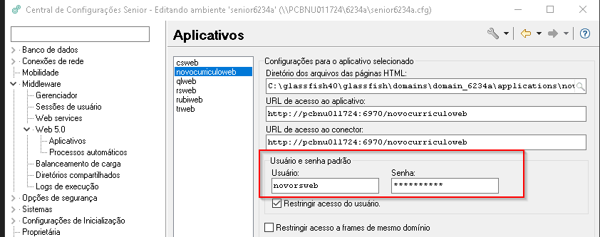 1. Acesse o SeniorConfigCenter localizado na pasta de instalação da G5, clique em MIddleware / Web 5.0 / Aplicativos;