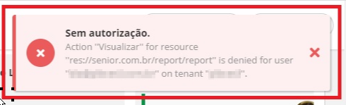 Esta mensagem é apresentada, pois o usuário não está vinculado a nenhum papel que contenha a permissão de visualizar o recurso res://senior.com.br/report/report.