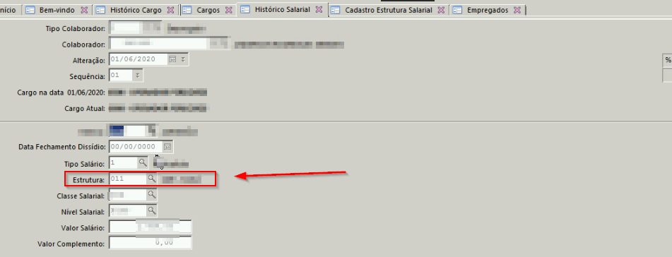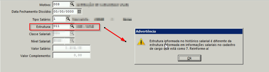 Por exemplo, o cargo esta utilizando a estrutura 11 por filial a partir de 01/01/2020, porém ao ajustar o salario para criar um novo histórico em 01/06 o sistema apresenta só a estrutura 7 que esta vinculada em informações salariais do cargo na data de 01/01/2019. Ao tentar forçar o histórico a utilizar a estrutura 11, ocorre o erro abaixo: