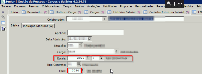 Após remover a abrangência de escala definida na estrutura salarial por filial, a mesma foi considerada na alteração de histórico salarial deste colaborador: