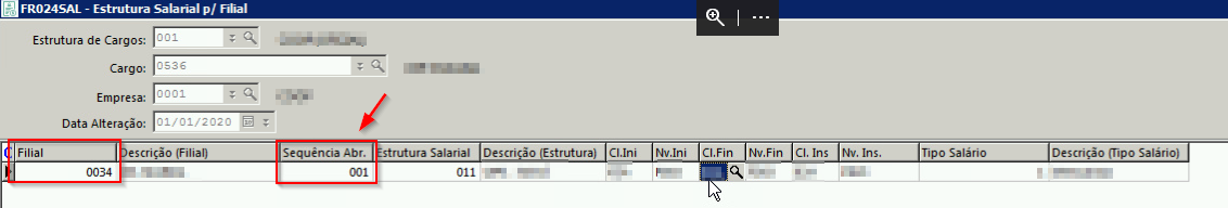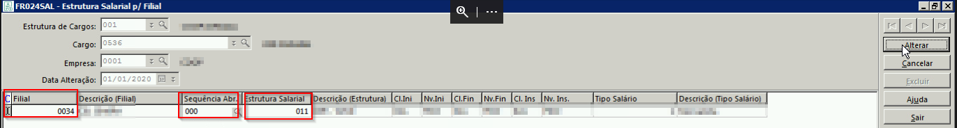 Problema: Cliente utiliza a estrutura salarial cadastrada em informações salariais do cadastro do cargo na data de 01/01/2019, porém a partir de 01/01/2020 o cargo tem também a estrutura salarial por filial. Identificamos que no caso de dois cargos não esta sendo considerado a estrutura por filial.