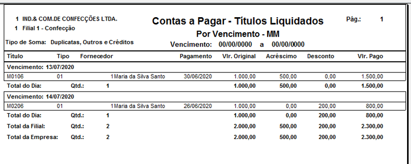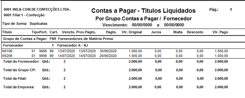 Utilizando por exemplo o relatório de títulos liquidados do contas a pagar FPCP038 traz corretamente as informações. Veja exemplo: