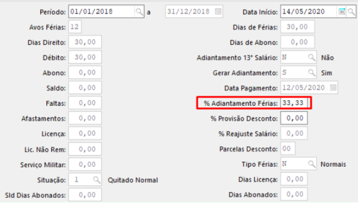 O recibo de férias do colaborador foi calculado utilizando a opção '% Adiantamento Férias' = 33,33%.
