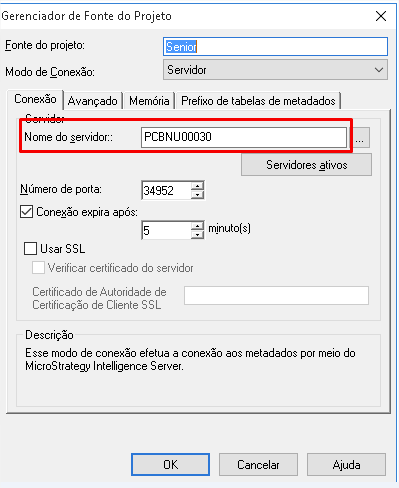 3 - Na tela que será exibida, verifique se o campo Nome do Servidor o nome ou IP está correto. Este endereço tem de ser o servidor onde o MSTR está instalado.