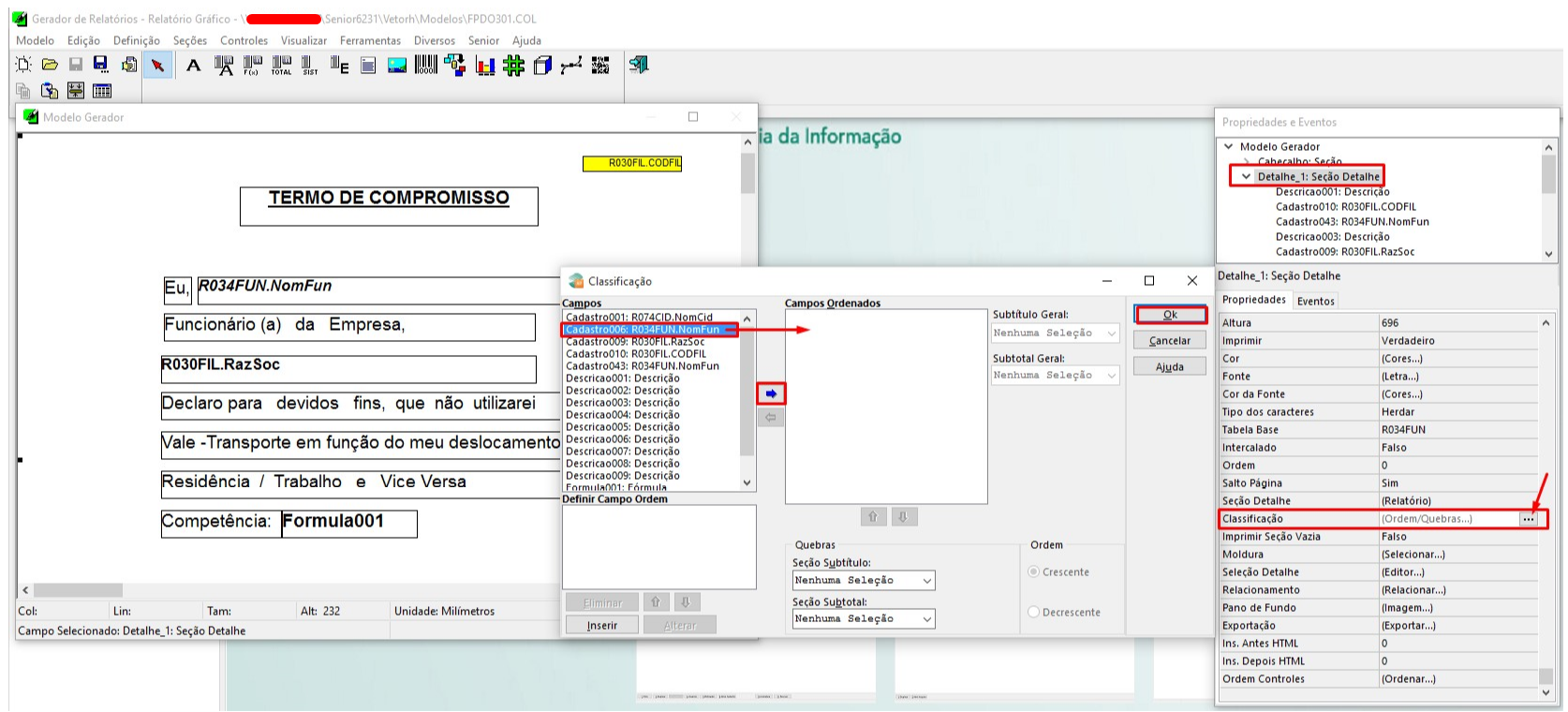 - Selecionar o campo Cadastro006: R034FUN.NomFun e passa-lo do quadro Campos para o quadro Campos Ordenados;