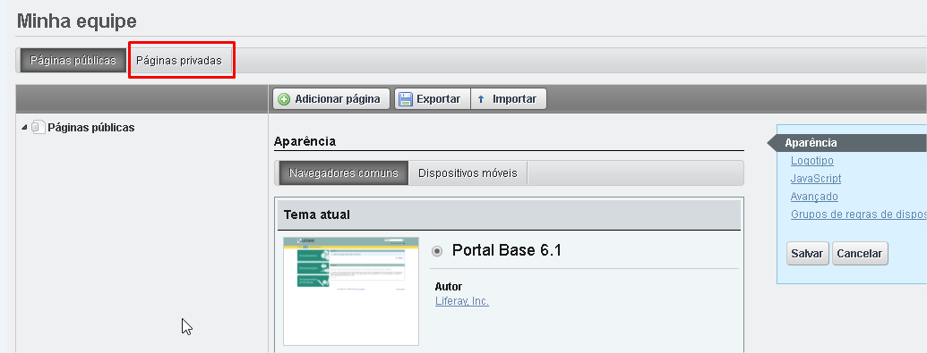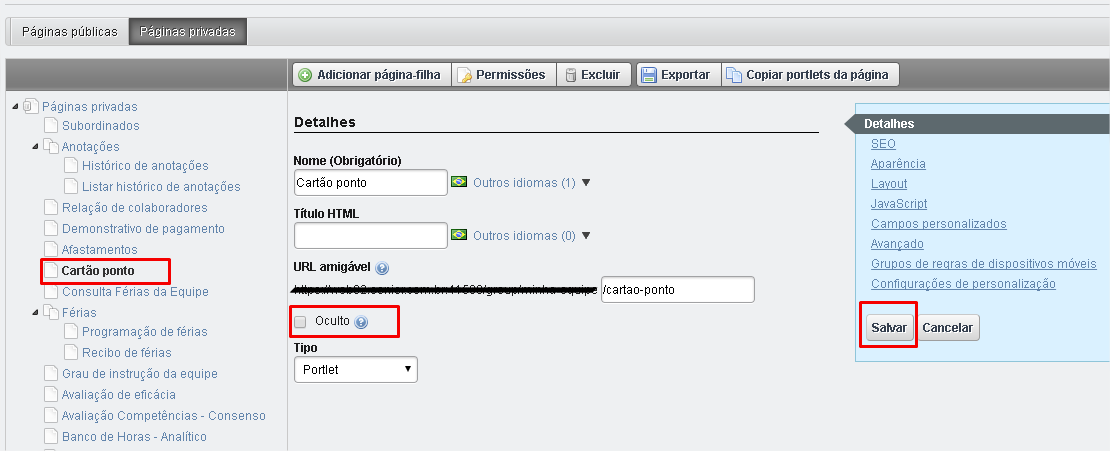 5 - Selecione a página que se deseja remover a visualização e marque a opção Oculto. Em seguida clique no Salvar: