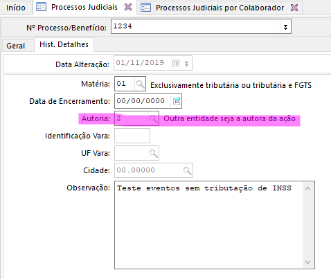 Para realizar o cadastro do processo judicial para isenção da contribuição previdenciária para os colaboradores quando o processo é feito por um terceiro e não a empresa (cliente), acesse o menu Empresas > Processos Judiciais, preencha os dados conforme necessidade e na aba Hist. Detalhes, campo Autoria, informe a opção 2 - Outra entidade seja a autora da ação: