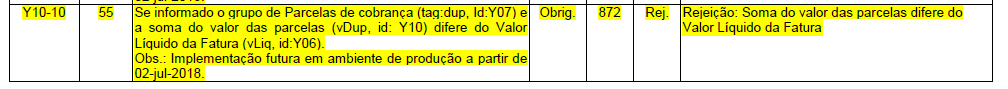 Solução: Solução 21943: a NT 2016.002 v1.51 da SEFAZ Nacional determina de que a Rejeição 851 ou 872 - Soma do valor das parcelas difere do Valor Líquido da Fatura será aplicada pela SEFAZ em ambiente de produção a partir de 02/07/2018. Segue print abaixo: