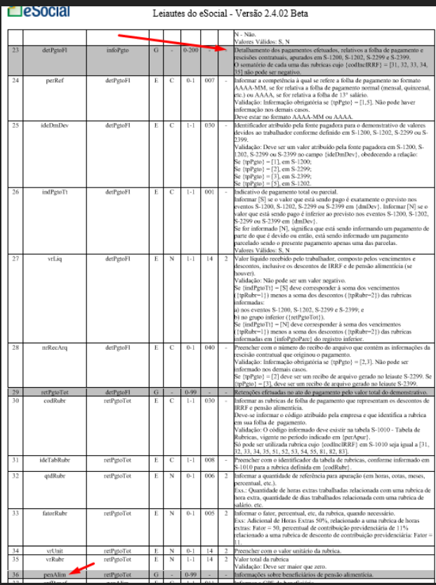 Descrição do infoPgto no layout do S-1210: Detalhamento dos pagamentos efetuados, relativos a folha de pagamento e rescisões contratuais, apurados em S-1200, S-1202, S-2299 e S-2399. O somatório de cada uma das rubricas cujo {codIncIRRF} = [31, 32, 33, 34, 35] não pode ser negativo.