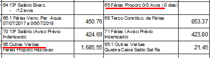 Para um colaborador que possui férias vencidas, indenizadas e proporcionais, verificamos que o sistema não está listando corretamente o campo 65. Férias Proporcionais no Recibo de Rescisão. Este campo está sendo listado com valor 0,00 e os valores de férias proporcionais estão sendo listados no campo Outras Verbas: