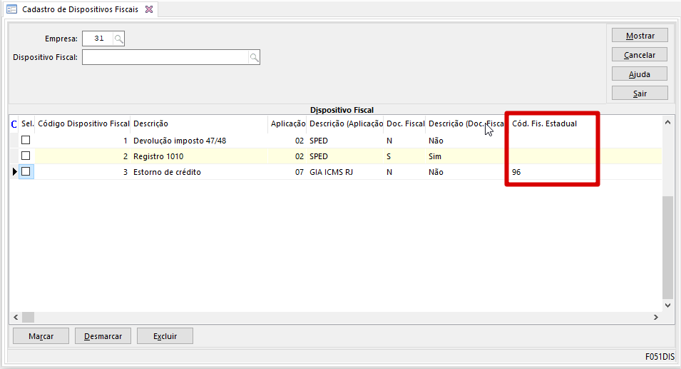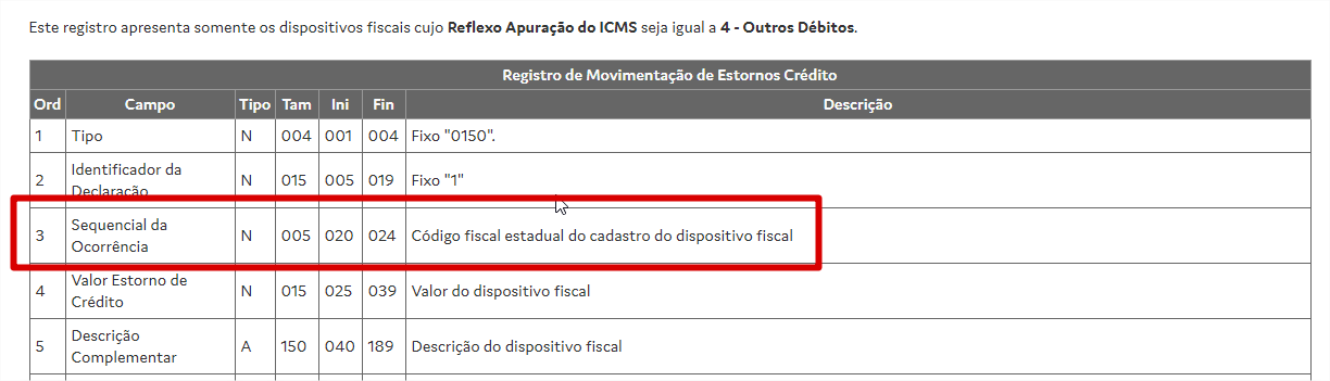 Essa sequencia é buscada do campo 'Código Fiscal Estadual' no cadastro do dispositivo fiscal F051DIS - Cadastros / Controladoria / Tributos / Dispositivos fiscais: