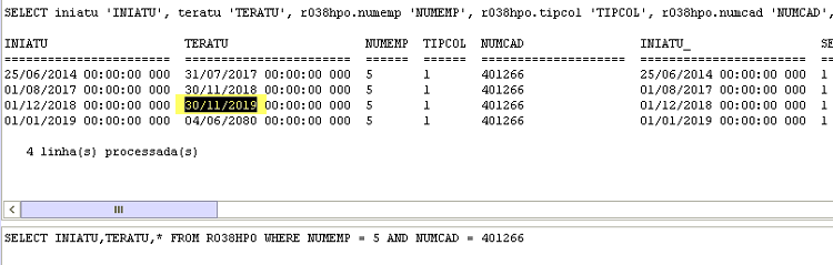 4. Execute o select: SELECT INIATU,TERATU, * FROM R038HPO WHERE NUMEMP = XX and NUMCAD = YY;